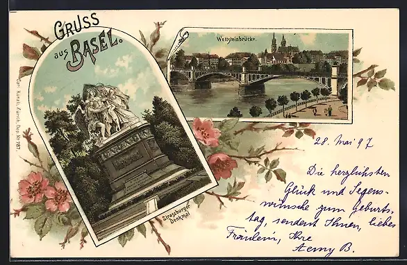 Lithographie Basel, Strassburger Denkmal, Wettsteinbrücke