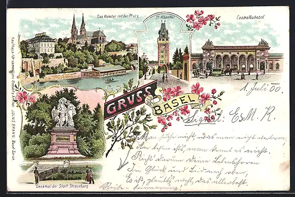 Lithographie Basel, Teilansicht, Centralbahnhof, Denkmal der Stadt Strassburg