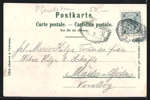 Personenbezogene Daten auf der Rückseite der Karte wurden durch blauen Textmarker unkenntlich gemacht. Die blauen Stellen sind auf die Vorderseite durchgeweicht und wirken sich negativ auf das Postkartenfoto aus
