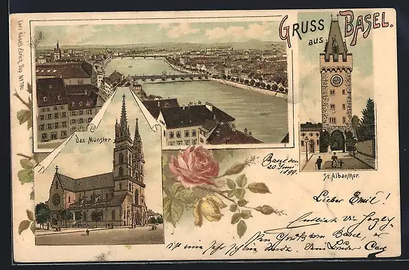 Lithographie Basel, Teilansicht, Münster, St. Albantor