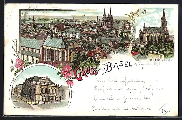 Lithographie Basel, Teilansicht, St. Elisabethenkirche, Theater
