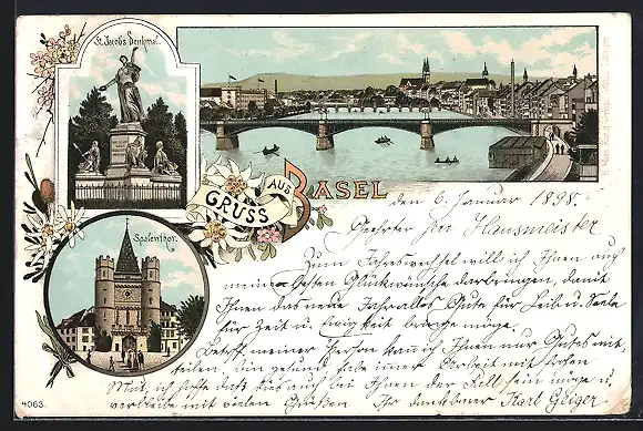 Lithographie Basel, Teilansicht, St. Jacobs-Denkmal, Spalentor