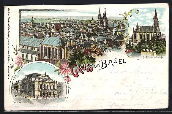 Lithographie Basel, Theater, St. Elisabethenkirche, Gesamtansicht