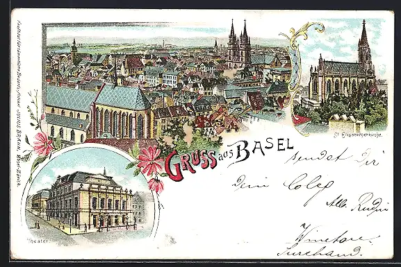Lithographie Basel, Theater, St. Elisabethenkirche, Gesamtansicht