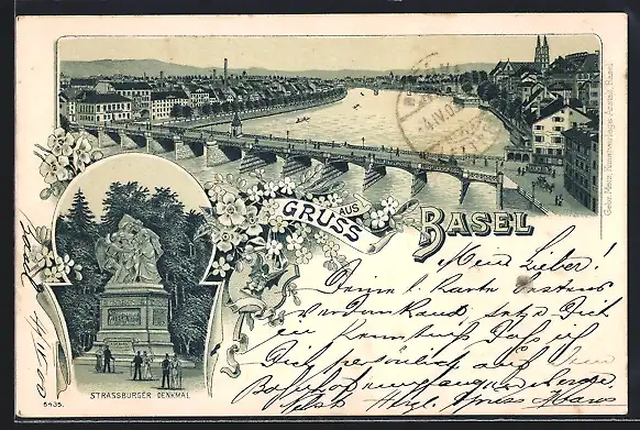 Lithographie Basel, Uferpartie mit Brücke, Strassburger Denkmal