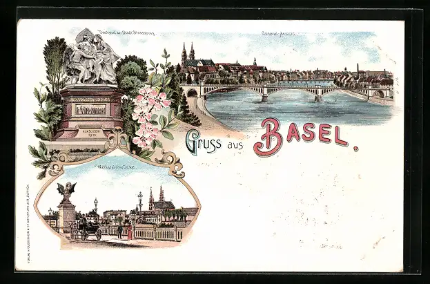 Lithographie Basel, Wettsteinbrücke, Denkmal der Stadt Strassburg, General-Ansicht