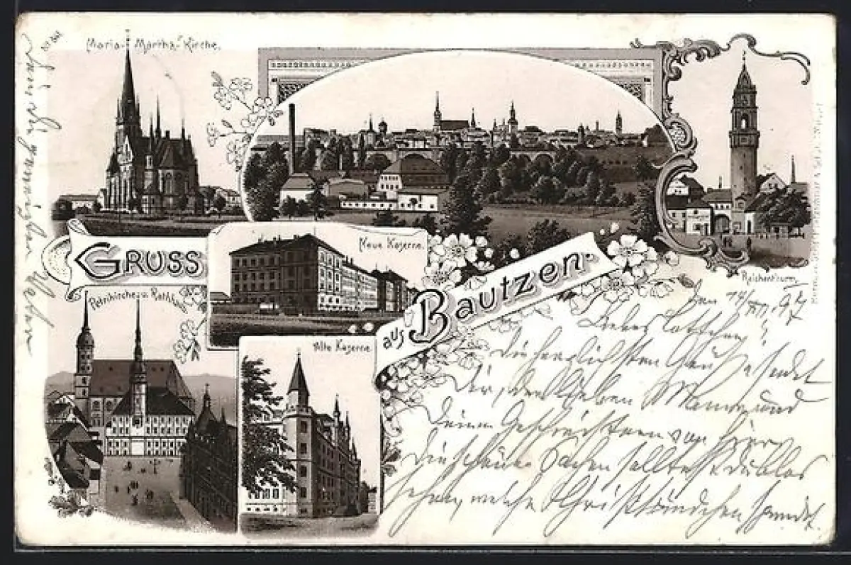Lithographie Bautzen, Maria-Martha-Kirche, Petrikirche & Rathaus, Neue Kaserne, Alte Kaserne, Reichenthurm