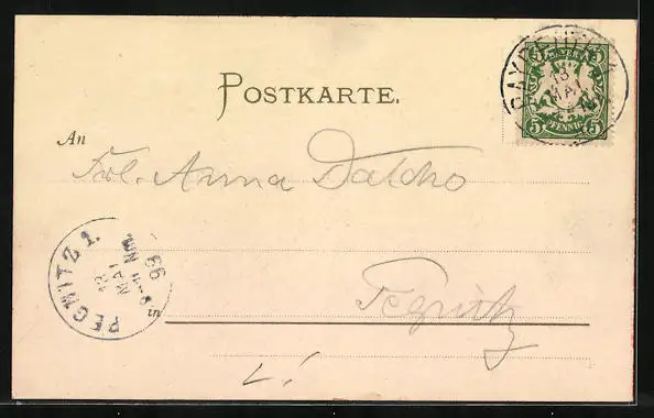 Personenbezogene Daten auf der Rückseite der Karte wurden durch blauen Textmarker unkenntlich gemacht. Die blauen Stellen sind auf die Vorderseite durchgeweicht und wirken sich negativ auf das Postkartenfoto aus