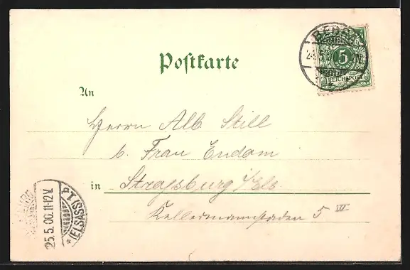 Personenbezogene Daten auf der Rückseite der Karte wurden durch blauen Textmarker unkenntlich gemacht. Die blauen Stellen sind auf die Vorderseite durchgeweicht und wirken sich negativ auf das Postkartenfoto aus