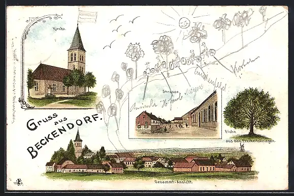 Lithographie Beckendorf, Kirche, Strasse, Totalansicht