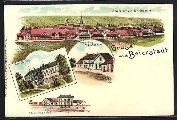 Lithographie Beierstedt, Gasthof von W. Schliephake, Vasel`s Garten, F. Siemann`s Gehöft
