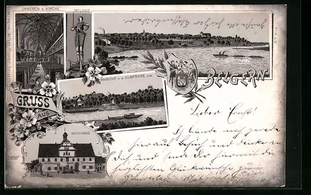 Lithographie Belgern, Rathaus, Inneres der Kirche, Roland