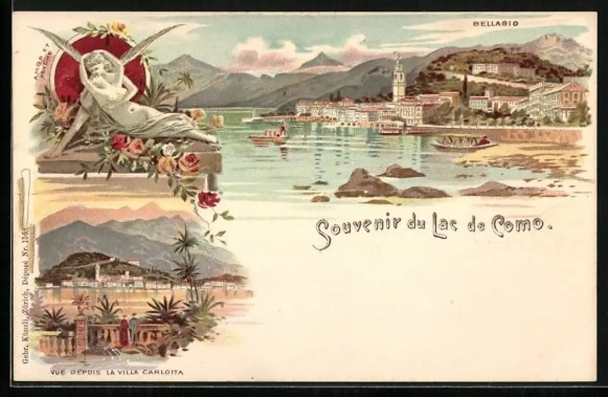 Lithographie Bellagio, Panorama generale, Vue Depuis la Villa Carlotta, Amor et Psyche, Boote