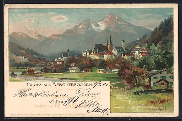 Lithographie Berchtesgaden, Teilansicht mit Kirche