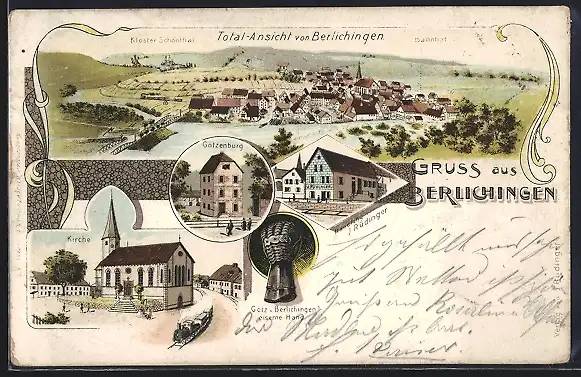 Lithographie Berlichingen, Handlung J. Rüdinger, Götzenburg, Kirche, Götz v. Berlichingen`s eiserne Hand, Totalansicht