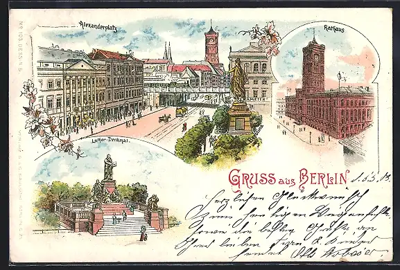 Lithographie Berlin, Alexanderplatz, das Rathaus, das Luther Denkmal