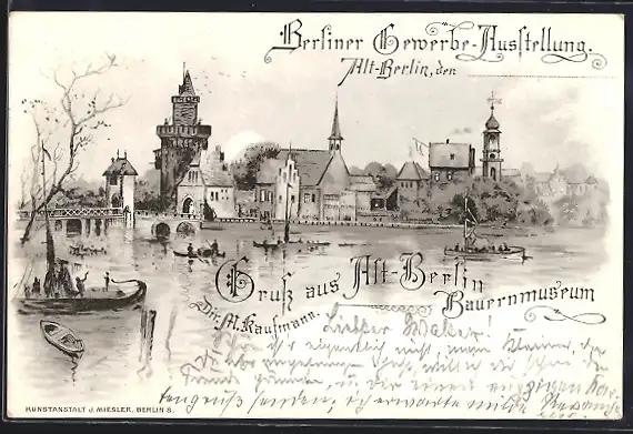 Lithographie Berlin, Berliner Gewerbe-Ausstellung, Flusspartie mit Booten