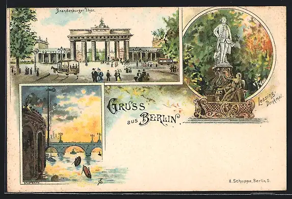 Lithographie Berlin, Brandenburger Thor, Stadtbahn, Lessing-Denkmal
