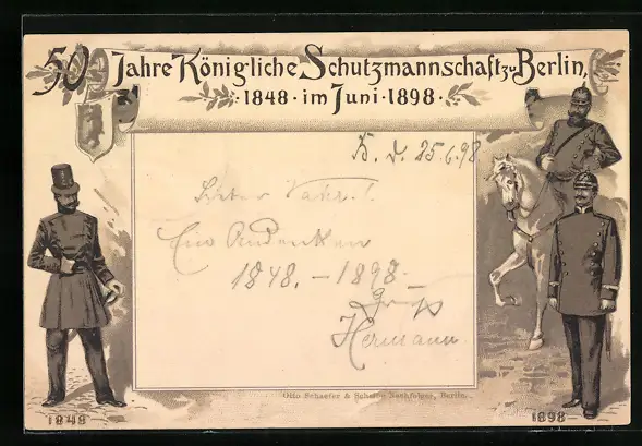 Lithographie Berlin, Festpostkarte, 50 Jahre Königliche Schutzmannschaft, Juni 1848-1898, Polizeiuniformen