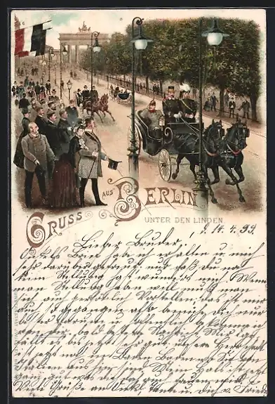 Lithographie Berlin, Kaiser fährt mit Pferdekutsche auf der Strasse Unter den Linden