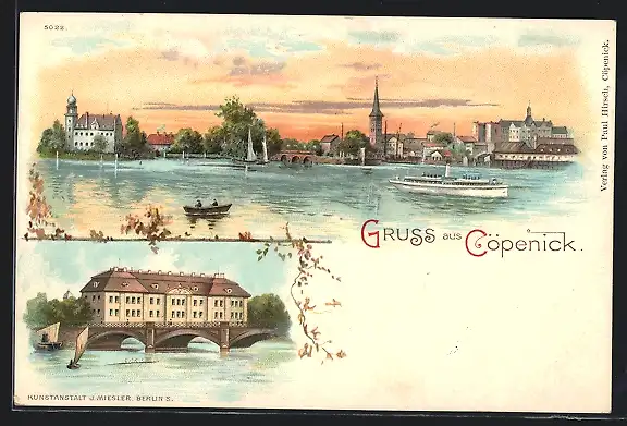 Lithographie Berlin-Köpenick, Ansicht vom Wasser bei Abendstimmung, Dampfer
