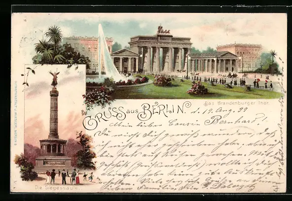 Lithographie Berlin, Pariser Platz, Brandenburger Tor mit Anlagen, Siegessäule