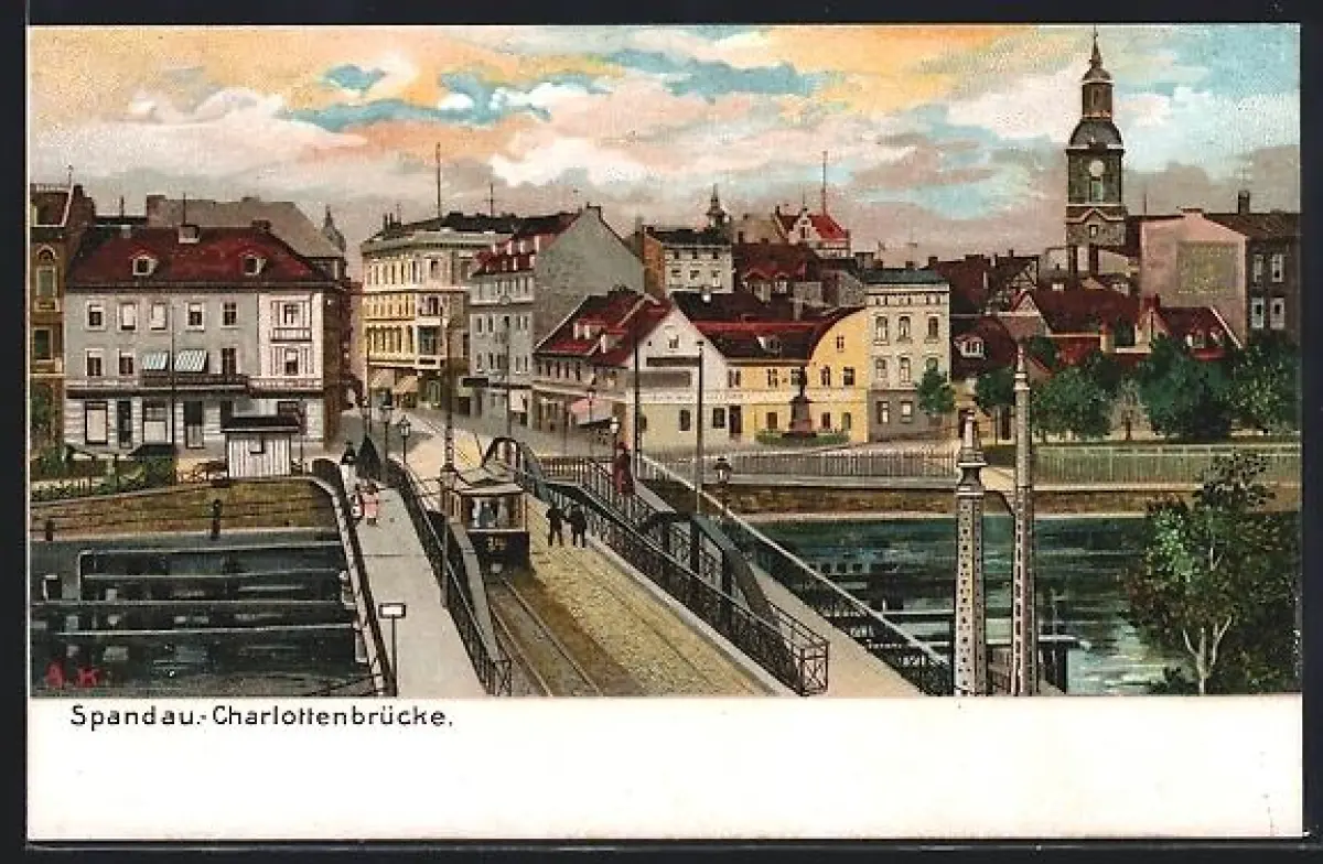 Lithographie Berlin-Spandau, Charlottenbrücke mit Strassenbahn