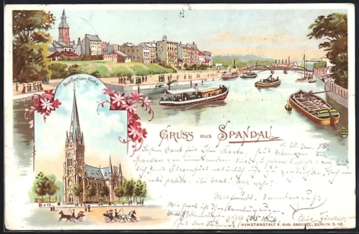 Lithographie Berlin-Spandau, Neue Garnison-Kirche, Dampdfer passiert den Ort, Pferdekutsche