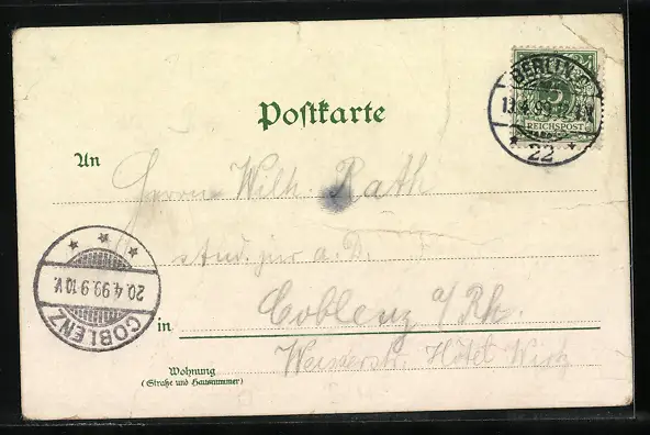Personenbezogene Daten auf der Rückseite der Karte wurden durch blauen Textmarker unkenntlich gemacht. Die blauen Stellen sind auf die Vorderseite durchgeweicht und wirken sich negativ auf das Postkartenfoto aus
