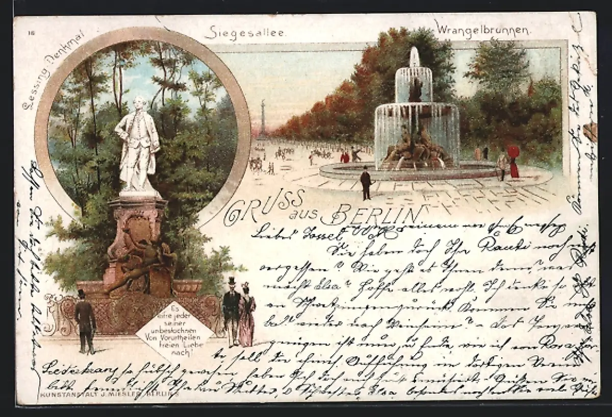 Lithographie Berlin-Tiergarten, Siegesallee, Lessing-Denkmal, Wrangelbrunnen