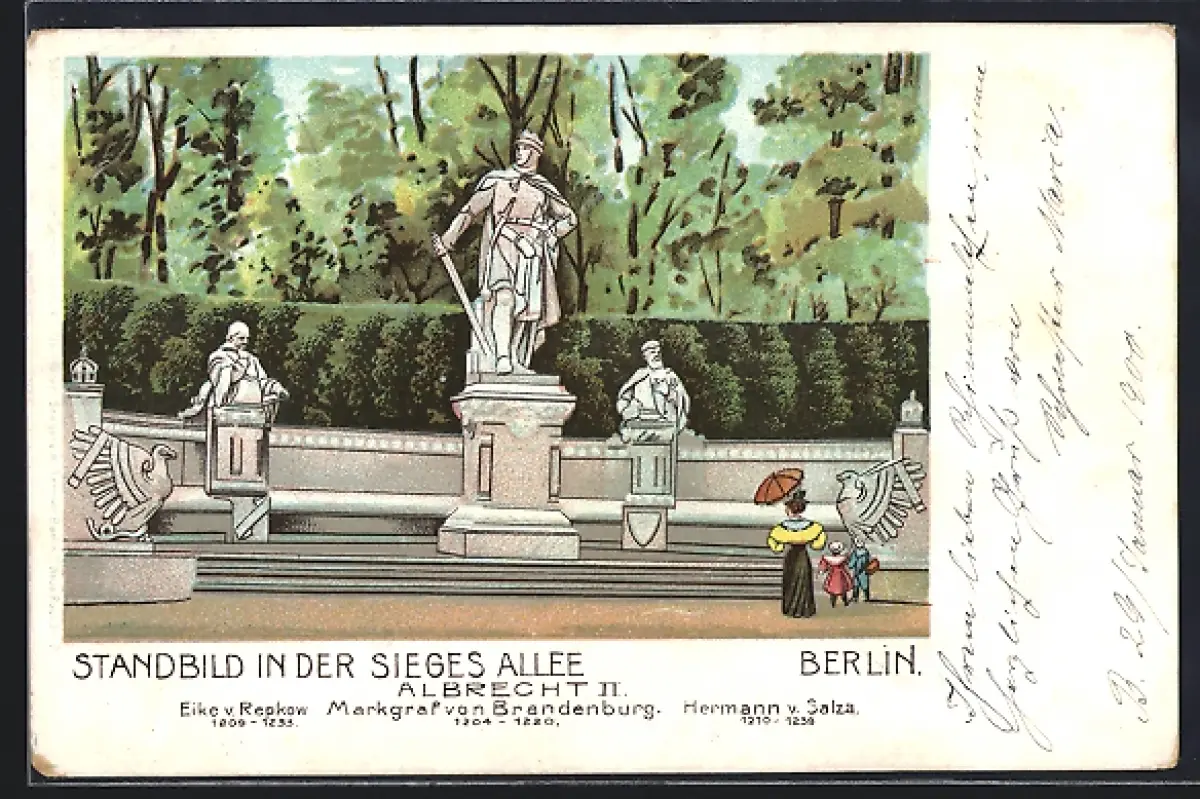 Lithographie Berlin-Tiergarten, Standbild Albrecht II. in der Siegesallee