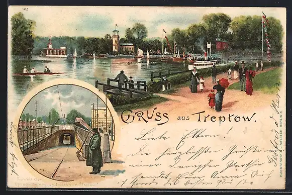 Lithographie Berlin-Treptow, Ansicht am Paradiesgarten, Tunnel der Spree-Untergrund-Bahn