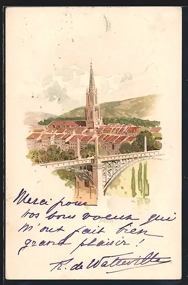 Lithographie Bern, Brückenpartie u. Teilansicht mit Kirche aus der Vogelschau