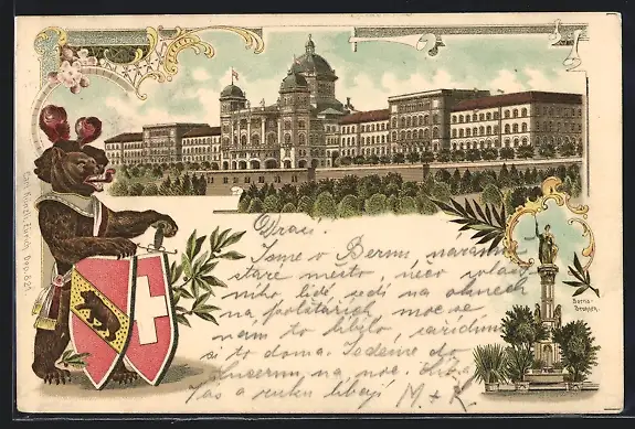 Lithographie Bern, Ortsansicht mit Berna-Brunnen