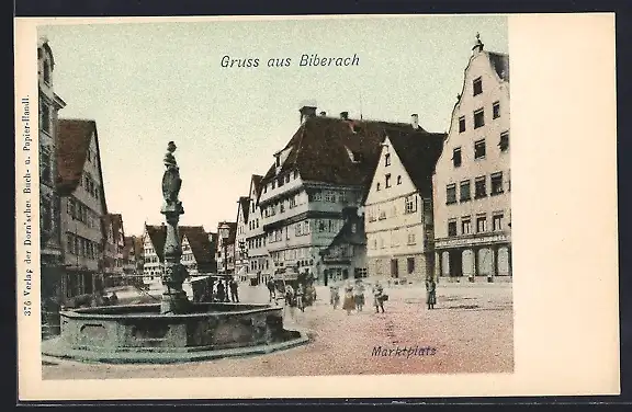 Lithographie Biberach / Riss, Strassenpartie am Marktplatz mit Springbrunnen