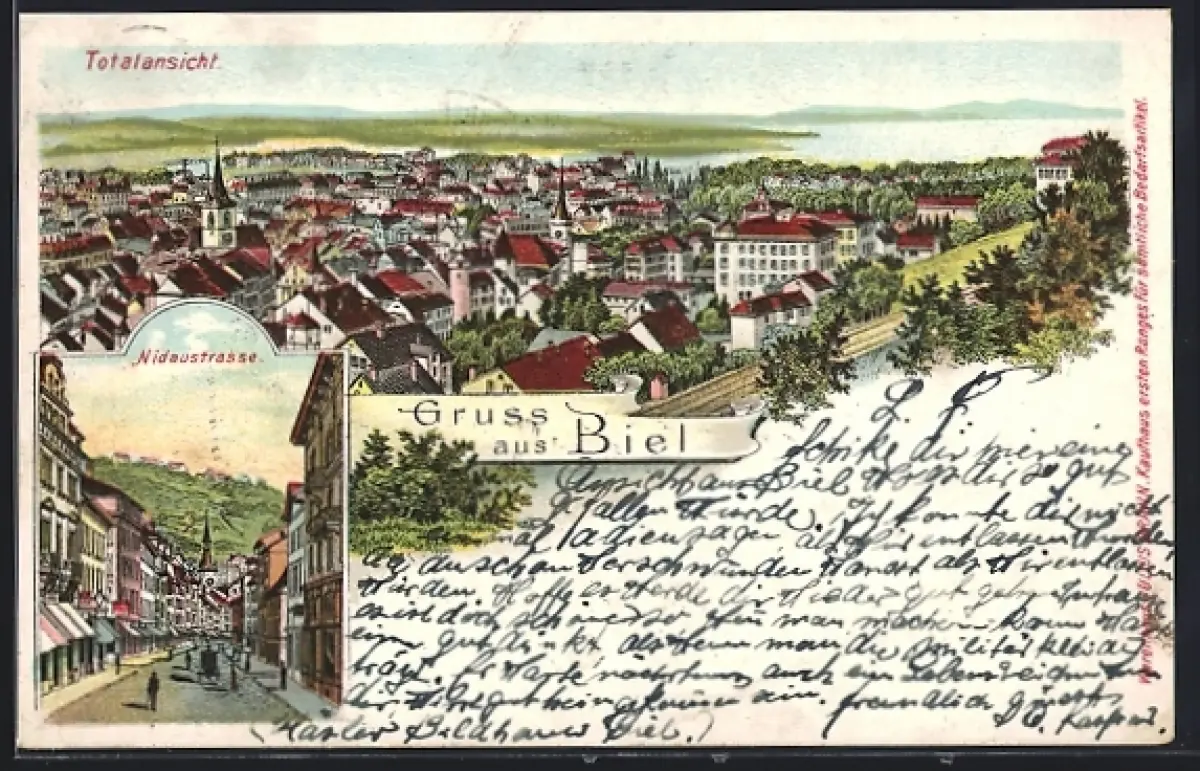 Lithographie Biel, Nidaustrasse, Totalansicht des Ortes aus der Vogelschau