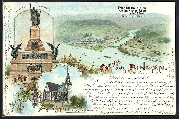 Lithographie Bingen, National-Denkmal, St. Rochus Kapelle