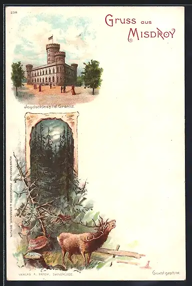 Lithographie Binz, Jagdschloss i. d. Gronitz, Hirsch im Wald