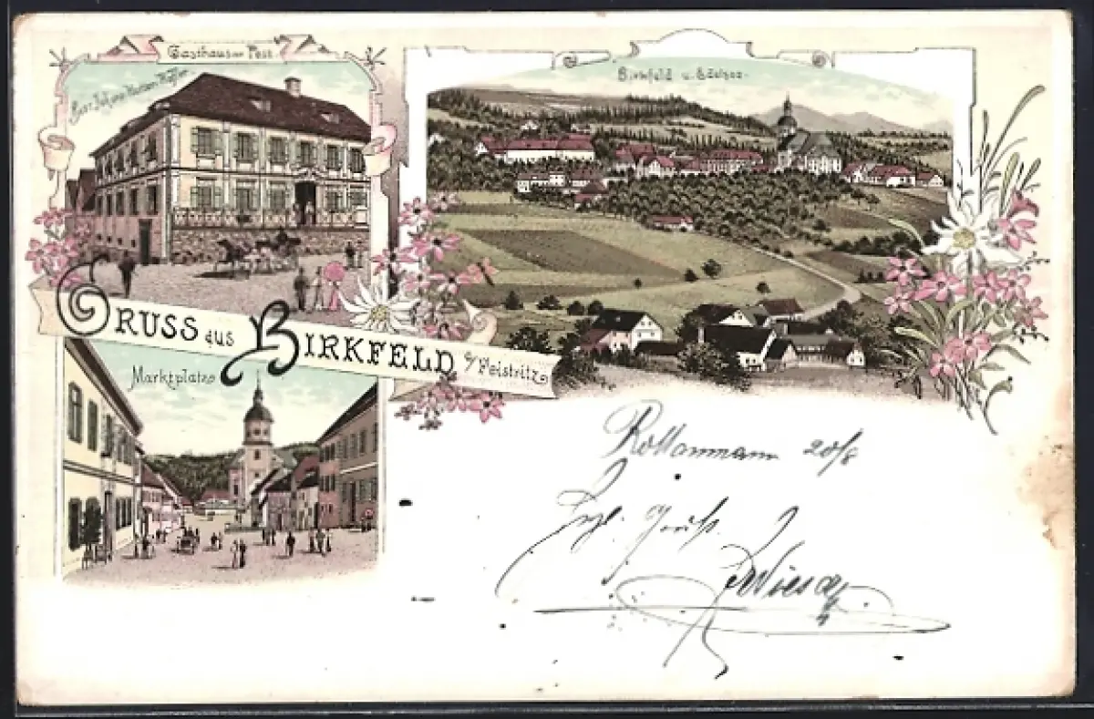 Lithographie Birkfeld a. Feistritz, Gasthaus zur Post, Restaurant Johann Hutter-Höfler, Marktplatz