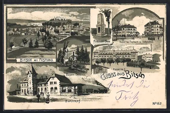 Lithographie Bitsch, Kaserne Freiherr v. Falkenstein, Bahnhof, Eisenbahn, Festung, Preussen-Stein