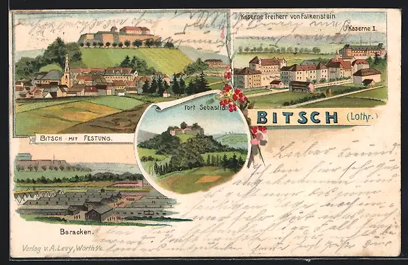 Lithographie Bitsch /Lothr., Ortsansicht mit Festung und Kaserne Freiherr von Falkenstein