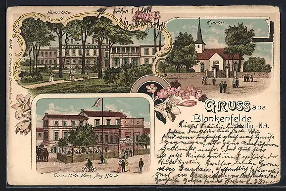 Lithographie Blankenfelde b. Berlin, Gast- und Cafe-Haus August Staab, Heimstätte, Kirche