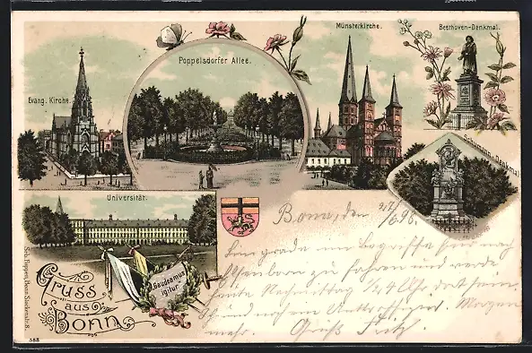 Lithographie Bonn, Poppelsdorfer Allee, Evang. Kirche, Münsterkirche, Beethoven-Denkmal, Schumann-Denkmal