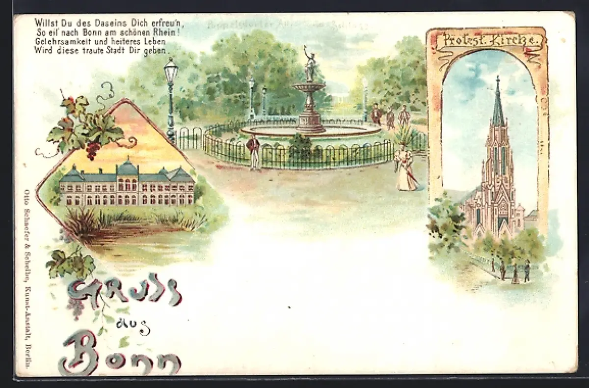 Lithographie Bonn, Protest. Kirche, Brunnen