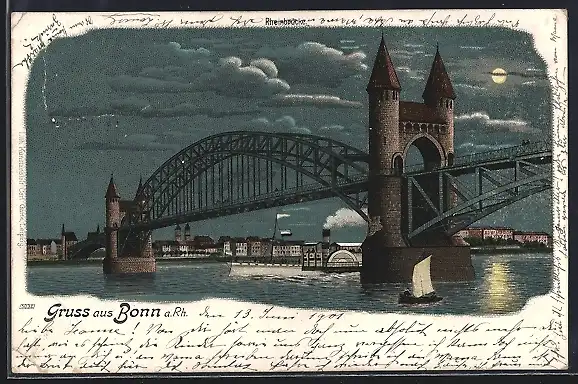Lithographie Bonn, Rheinbrücke mit Stadtpanorama