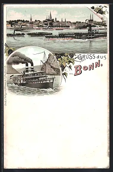 Lithographie Bonn, Stadtpanorama vom Fluss aus, Raddampfer
