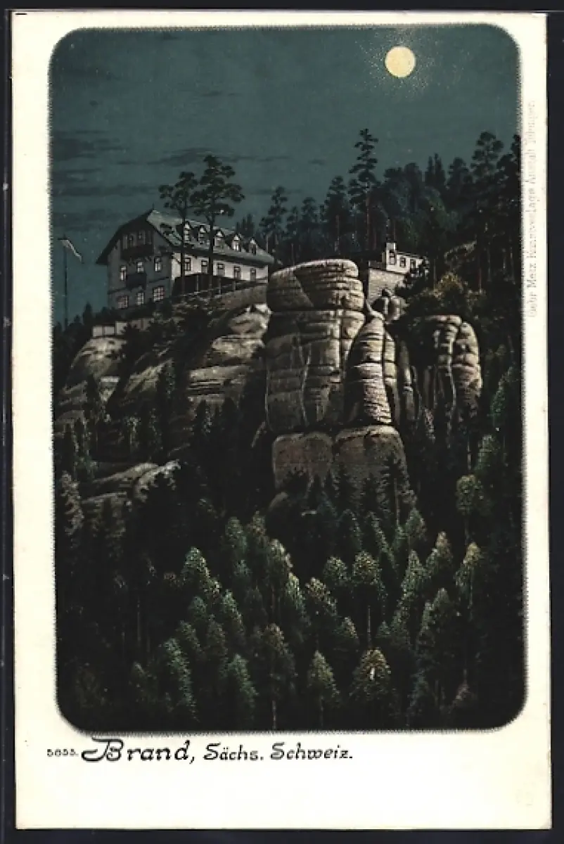 Lithographie Brand / Sächs. Schweiz, Gasthaus bei Nacht