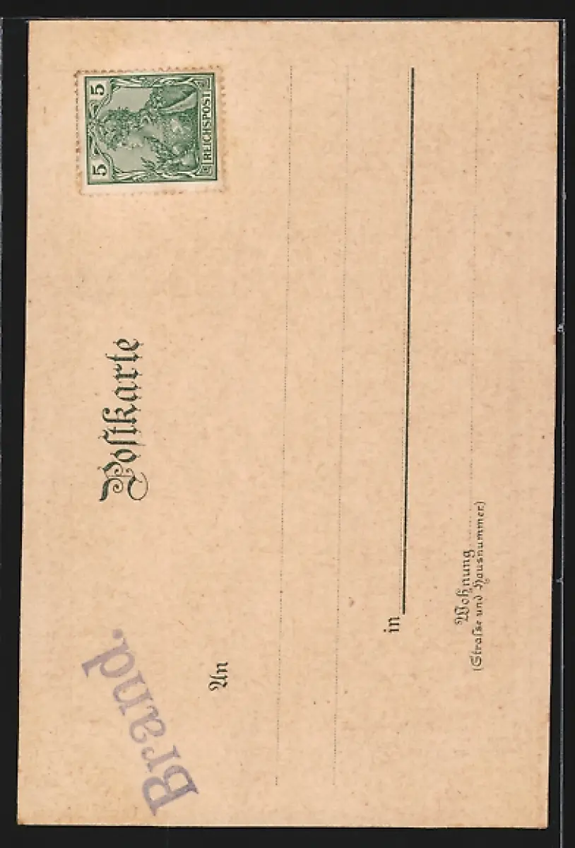 Personenbezogene Daten auf der Rückseite der Karte wurden durch blauen Textmarker unkenntlich gemacht. Die blauen Stellen sind auf die Vorderseite durchgeweicht und wirken sich negativ auf das Postkartenfoto aus