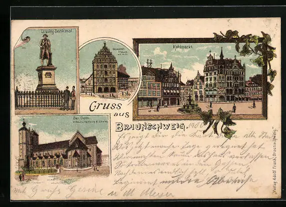Lithographie Braunschweig, Kohlmarkt, Lessing-Denkmal, Dom