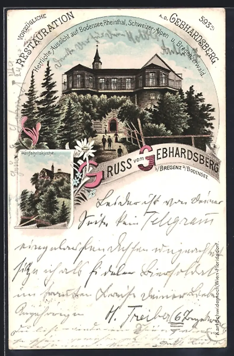 Lithographie Bregenz a. Bodensee, Restauration a. d. Gebhardsberg, Wallfahrtskirche